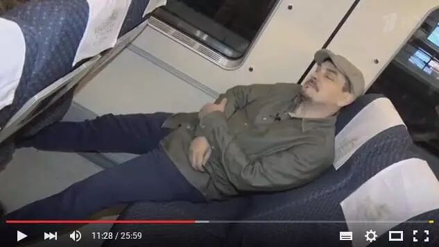 待合室や周辺施設の探索を終えると、彼は列車に乗り遅れないよう、急ぎ足でプラットホームに向かった。一般庶民と同じ乗車体験をするため、二等席の切符を購入、「横たわった」姿勢になり、「さあみなさん、見てください!脚をこんなにのびのびと伸ばせる」と、乗り心地の良さを視聴者にアピールした。