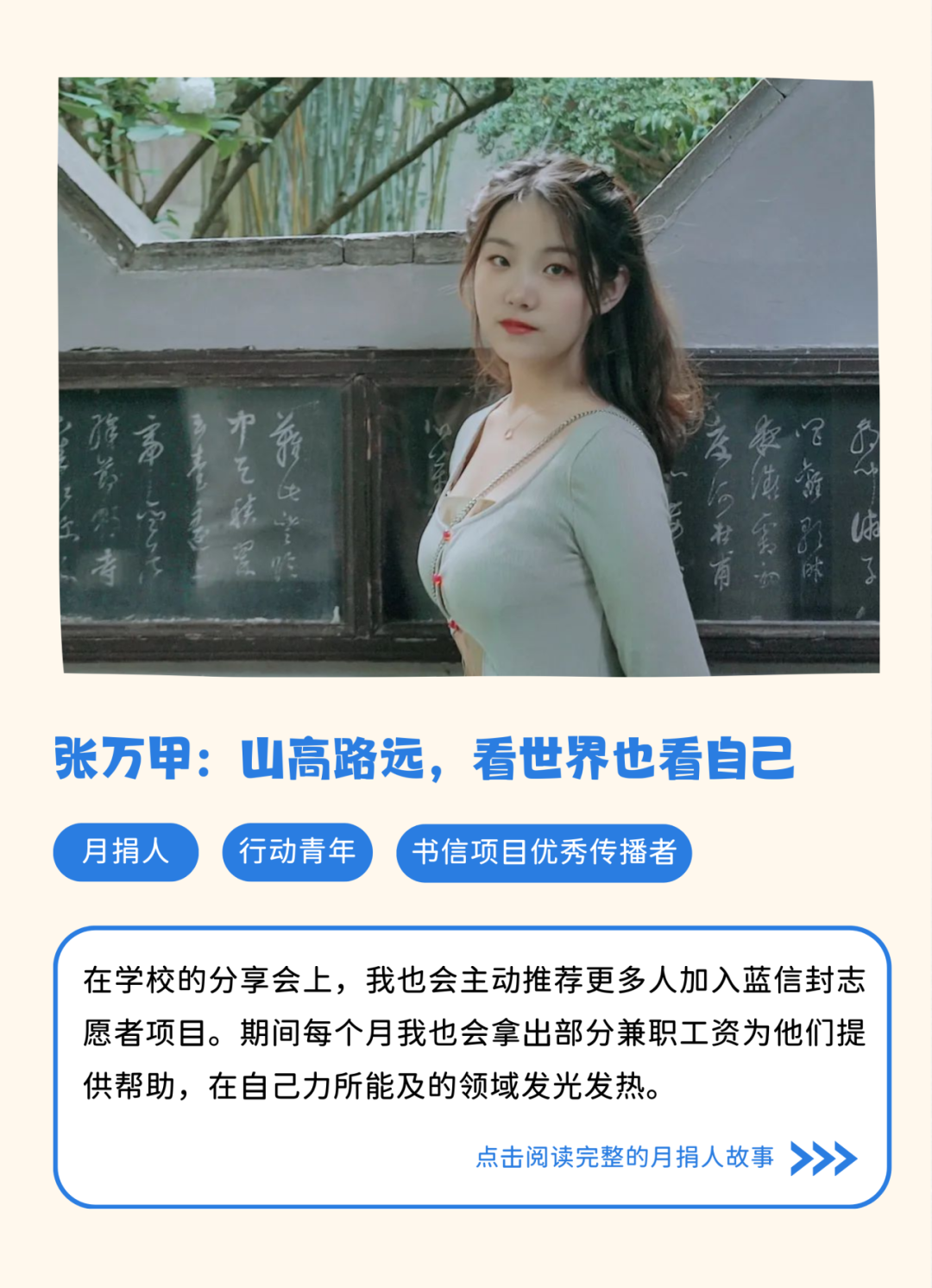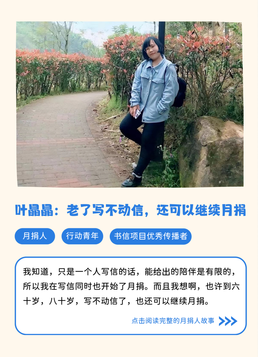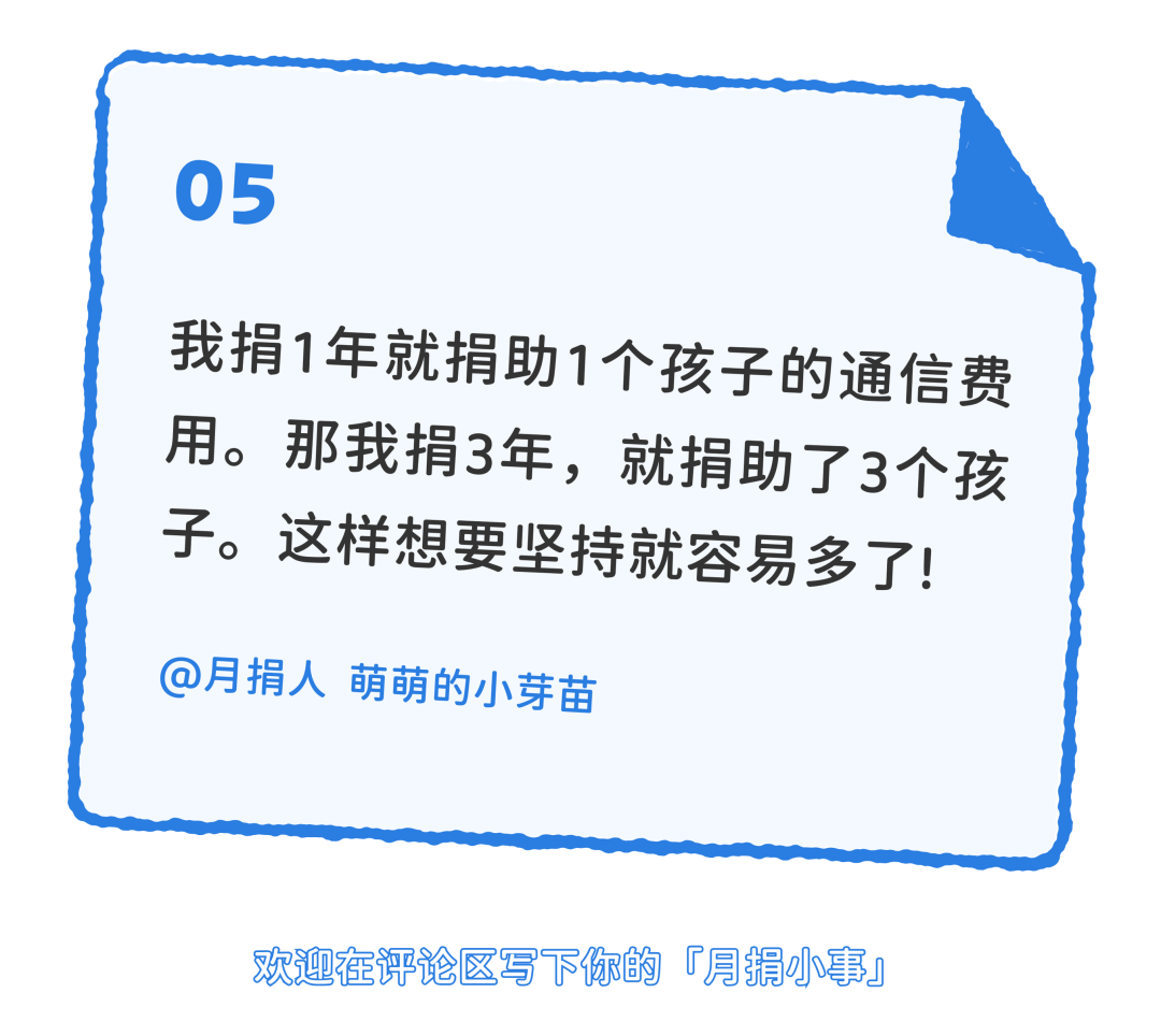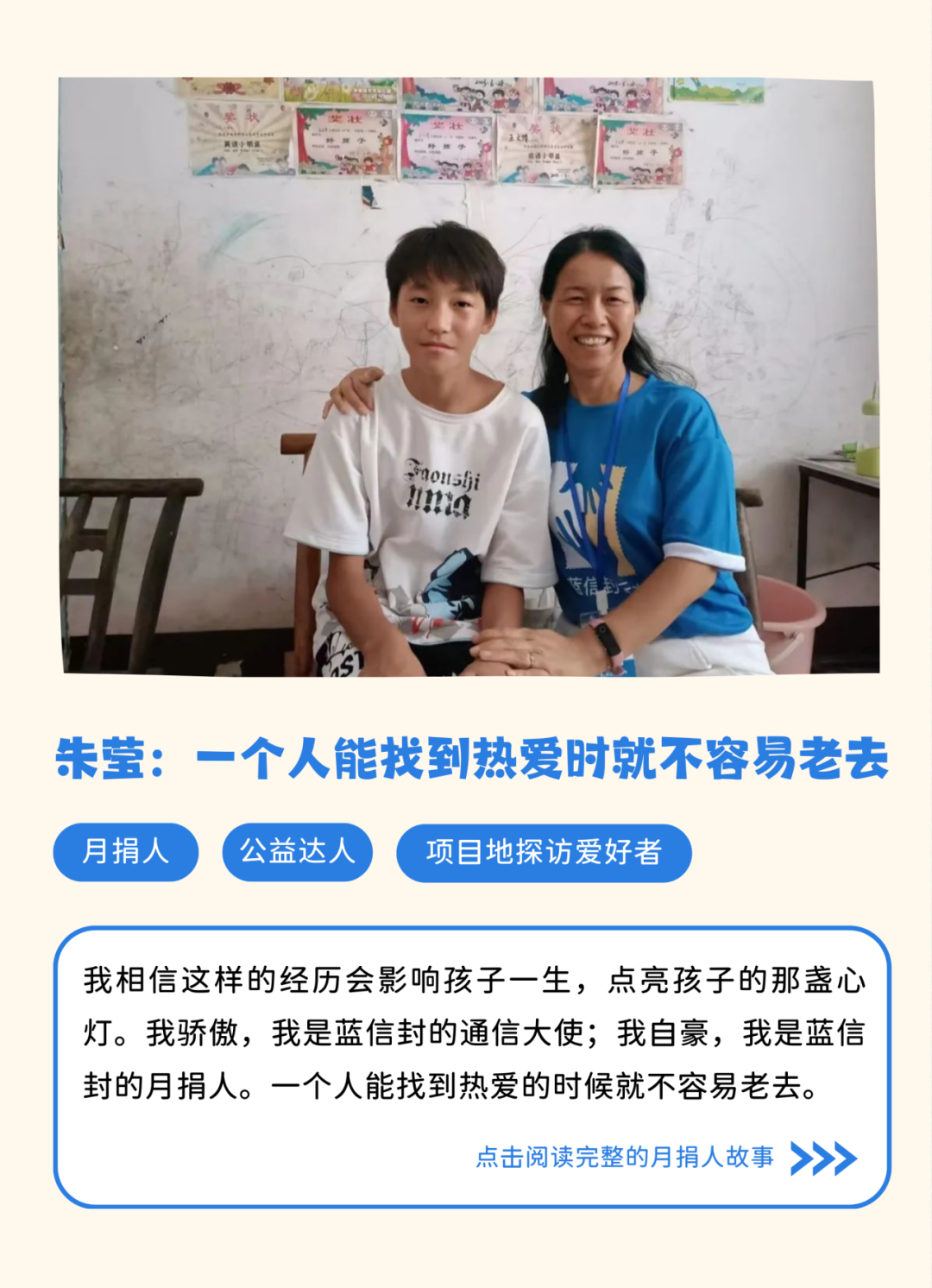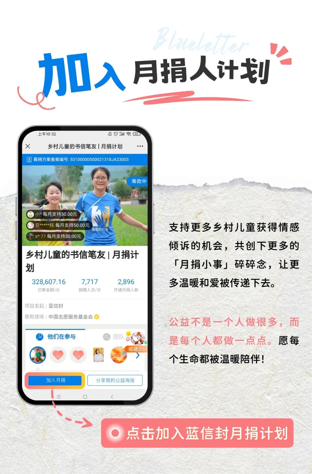也欢迎大家加入蓝信封月捐人的大家庭,支持更多乡村儿童获得情感倾诉的机会,共创下更多的「月捐小事」碎碎念,让更多温暖和爱被传递下去。