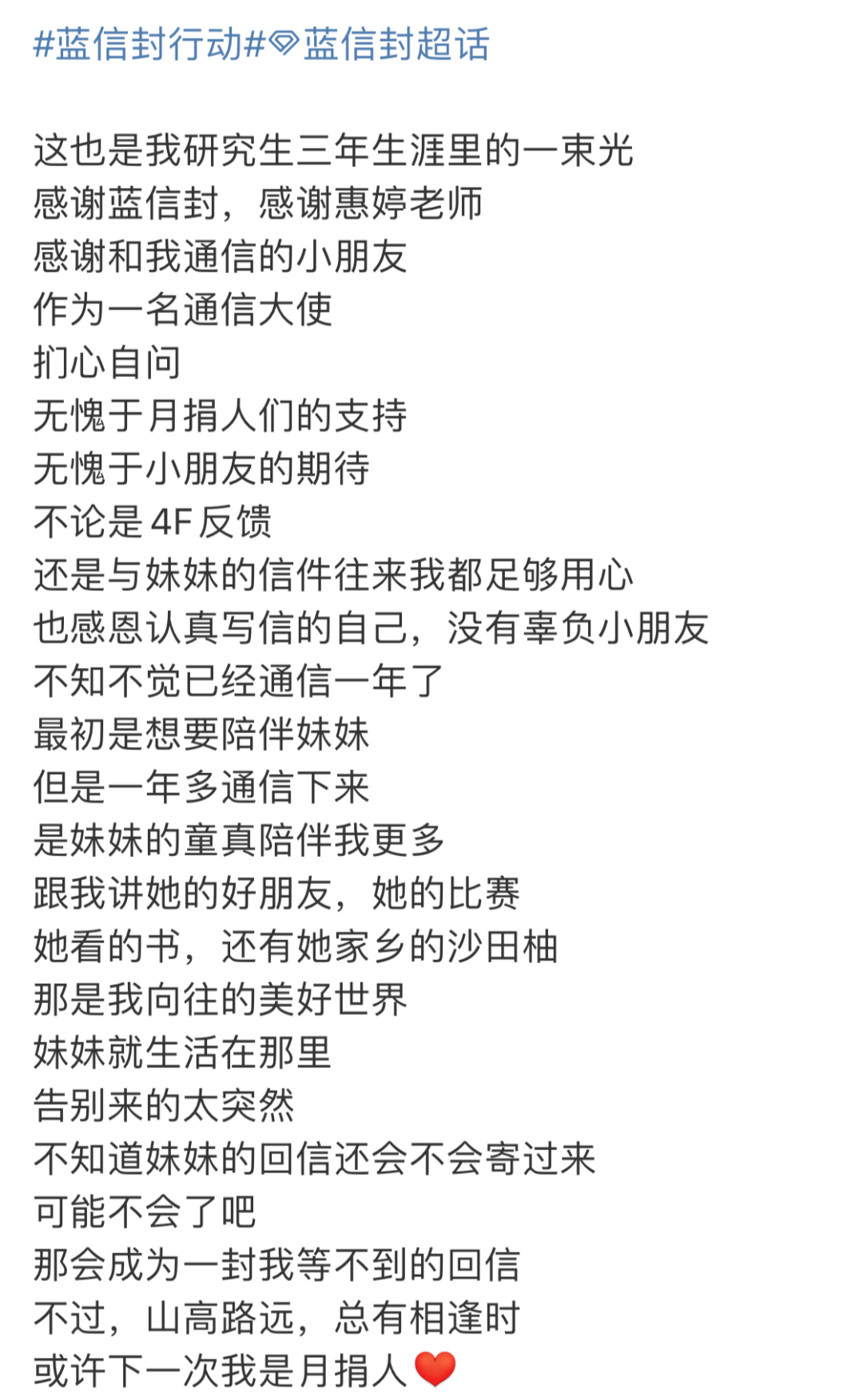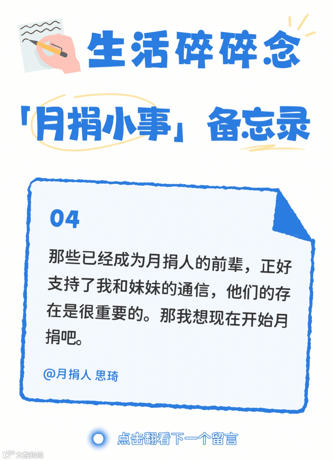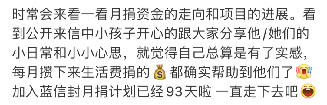 有时候,还会刷到通信大使给月捐人的留言:“感恩认真写信的自己,没有辜负小朋友,无愧于月捐人们的支持。”