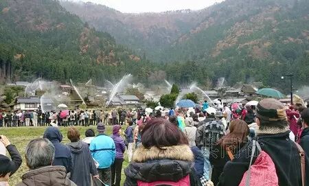 1日、現地では年2回行われる消防団の一斉放水が実施された。消防の放水銃から吹き出す水柱が曲線を描いて屋根の上に撒かれ、初冬の景色に趣を添えていた。台湾地区台南市から来た会社職員の陳香君さん(32)は放水を見物して、交通が少し不便でもとても満足したと語った。日本の旅行関連サイトやブログに掲載されていた写真に惹かれて、電車とバスを乗り継いで来たとのこと。普段見ることのできない景色は、まるで別の世界に来たようで、とても楽しい時を過ごすことができたと語った。