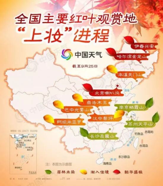 現時点では伊春興安国家森林公園や哈爾浜(ハルビン)金龍山森林公園、北京喇叭溝の原始森林公園などが、紅葉鑑賞のベストシーズンに入っている。このほか、遼寧本渓関門山国家森林公園、陝西商洛木王国家森林公園、漢中黎坪国家森林公園一帯および四川省の巴中光霧山、阿バ米亜羅の各地でも、紅葉が色づき、ベストシーズンに入りつつある。一方、蘇州天平山や南京栖霞山などでは、紅葉の見ごろまではあと1ヶ月ほど待たなければならない。
