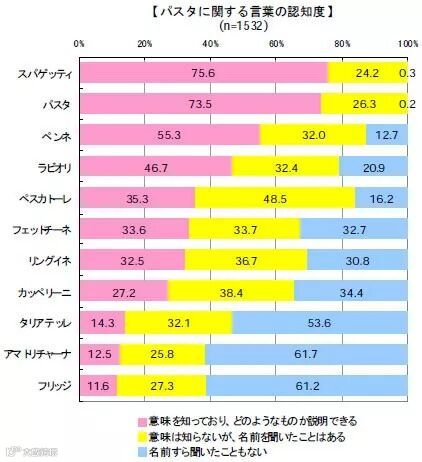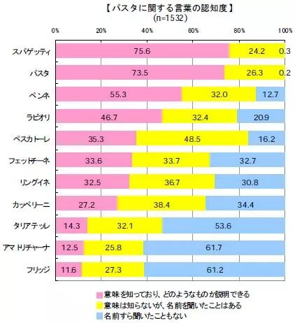 日本美食网站gurunavi曾经做过一项调查,向被调查者列举出属于「パスタ」范畴的若干个菜品名称,由被调查者来回答是否了解。调查结果显示,人们对「スパゲッティ」一词的认知度最高,为75.6%;其次是「パスタ」,为73.5%;再次是「ペンネ」(penne,短切通心粉),为55.3%。