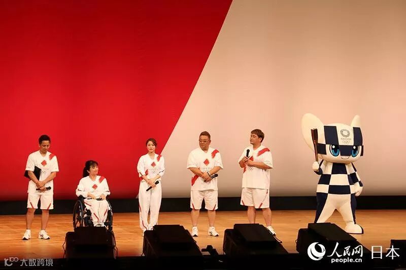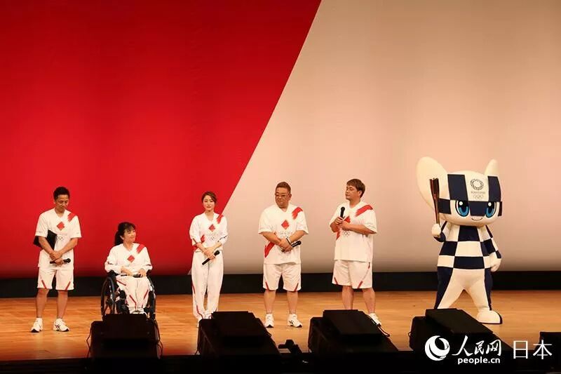 火炬接力手官方宣传大使野村忠宏、田口亚纪、石原里美、“三明治人”组合和东京2020吉祥物Miraitowa 在“东京2020奥运会火炬接力手招募宣传会”上亮相。(从左至右)。
