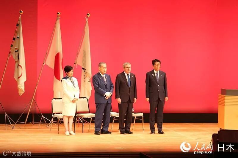 日本首相安倍晋三、国际奥委会主席巴赫、东京2020组委会主席森喜朗、东京都知事小池百合子。(从右至左)。