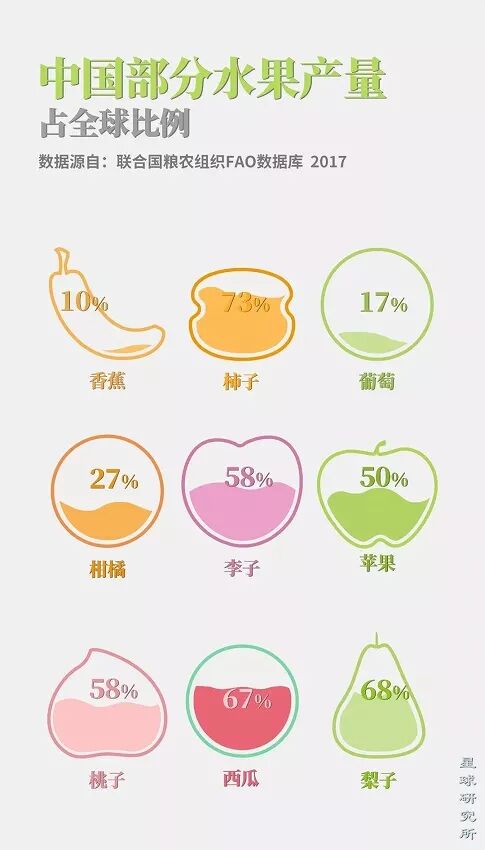 (中国の一部果物の生産高が世界生産高に占める割合。ほぼ消費量の割合と同一視できる。グラフ作成:張靖/星球研究所)