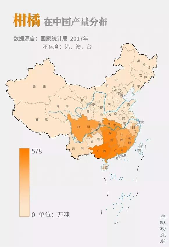 (中国柑橘類の生産量分布。グラフ作成:張靖&鞏向傑/星球研究所)