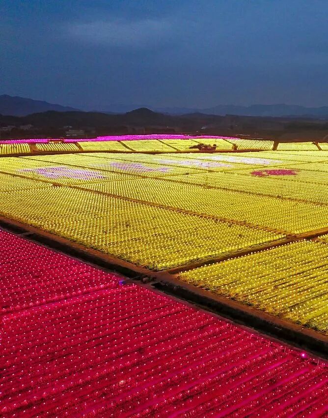 (広西壮族自治区南寧市のドラゴンフルーツ栽培拠点で、無数のLEDライトに同時に灯りがともされた壮観な光景。画像提供:VCG)