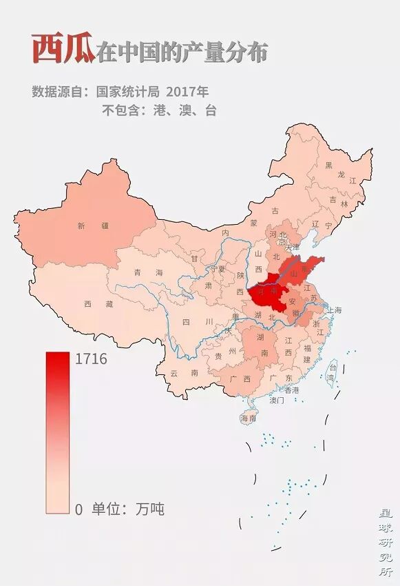 (中国スイカの生産量分布。マップ作成:張靖&鞏向傑/星球研究所)