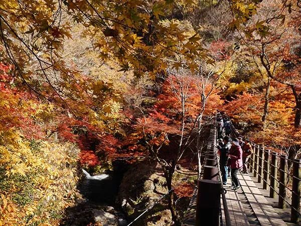 站在横跨溪谷的汐见瀑布吊桥上,可远眺四周美景。特别是金秋时节的璀璨红叶,非常值得一看。