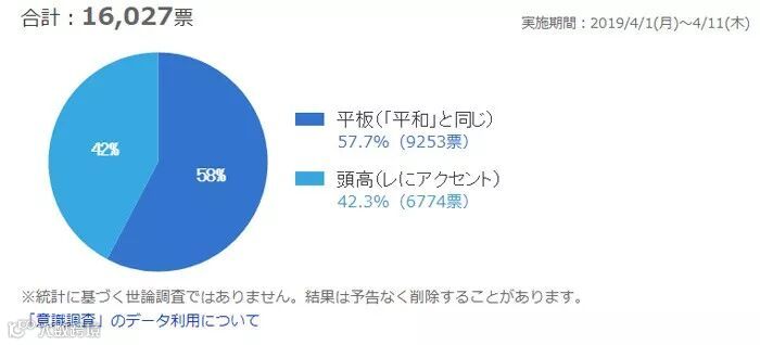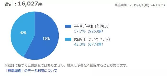 同时,日本雅虎新闻还曾于2019年4月1日-4月11日针对“令和”一词的读法进行了调查。该调查共收集到16027份结果,其中有57.7%的人选择“平板型”,42.3%的人选择“头高型”。