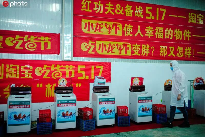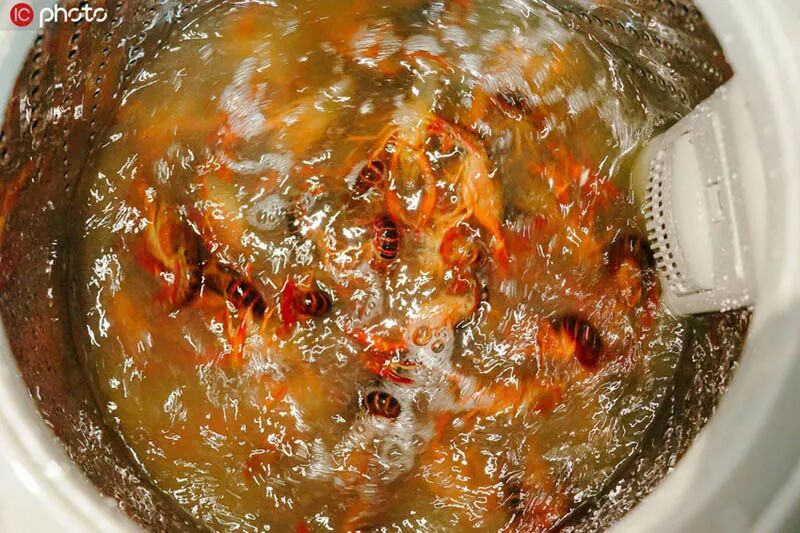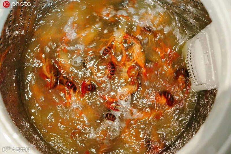 張さんは、「洗濯機1台につき3分間で50キロのザリガニを洗うことができる。洗い終わってもザリガニの99%はまだ生きている。グルグル回り、目が回って動けなくなっているだけで、洗浄2分後にはザリガニの爪を触ると、がっちりと挟んで離さなくなるほど元気だった。つまり洗濯機で洗われても、ザリガニがダメージを受けることはないということだ。開発したザリガニ専用の洗濯機はとても人気で、ショッピングサイト・淘宝では売り切れになっているほど」と説明する。
