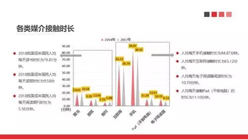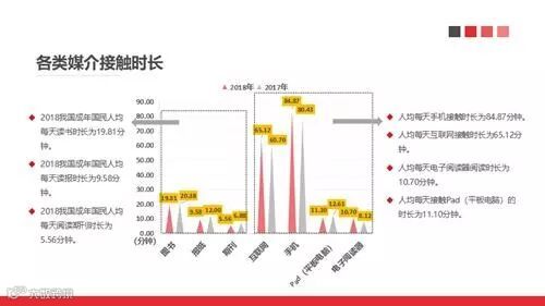 从对不同媒介接触时长来看,成年国民人均每天手机接触时间最长,为84.87分钟,互联网接触时长为65.12分钟,电子阅读器阅读时长为10.70分钟,均有所增长。