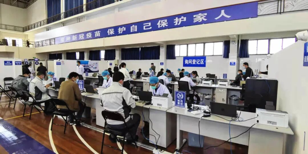 疫苗接种场地划分为健康申报区、咨询登记区、疫苗接种区和留观区四个区域,各区域标识清晰且相对独立。