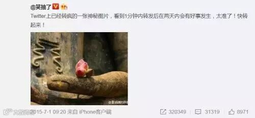 転載すると2日以内に良い事が起きるという海外で凄まじい勢いで拡散した「神秘」な画像(微博掲載画像)。