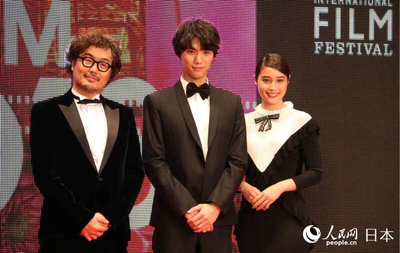 日本演员福士苍汰(中)和广濑爱丽丝(右)亮相红毯仪式。