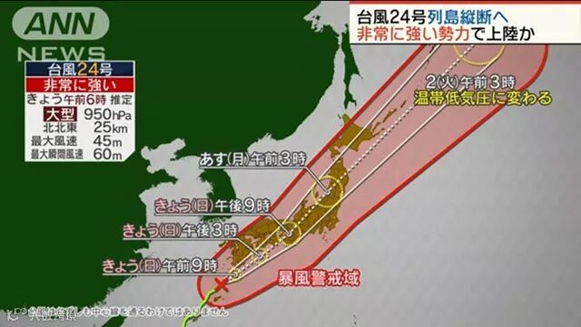 这是日本继9月4日第21号台风“飞燕”登陆后再次遭受极强台风袭击,一年两遇极强台风在历史上十分罕见。