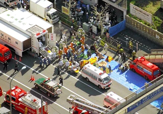 1995年,东京地铁沙林毒气事件发生之后,筑地站附近(朝日新闻)