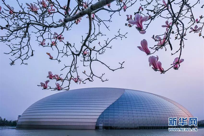 中国国家大劇院の前に咲くモクレンの花(3月21日、撮影・徐昱)。