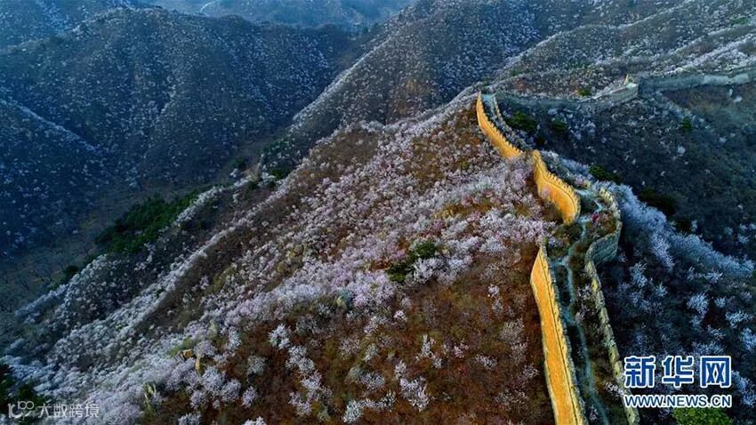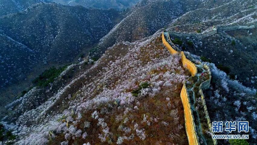 花が綻ぶ暖かい春が到来し、北京市懐柔区の黄花城古長城ではその周辺に山桃花とアンズの花が競うように咲き誇り、長く続く長城の景色に彩りを添えていた。