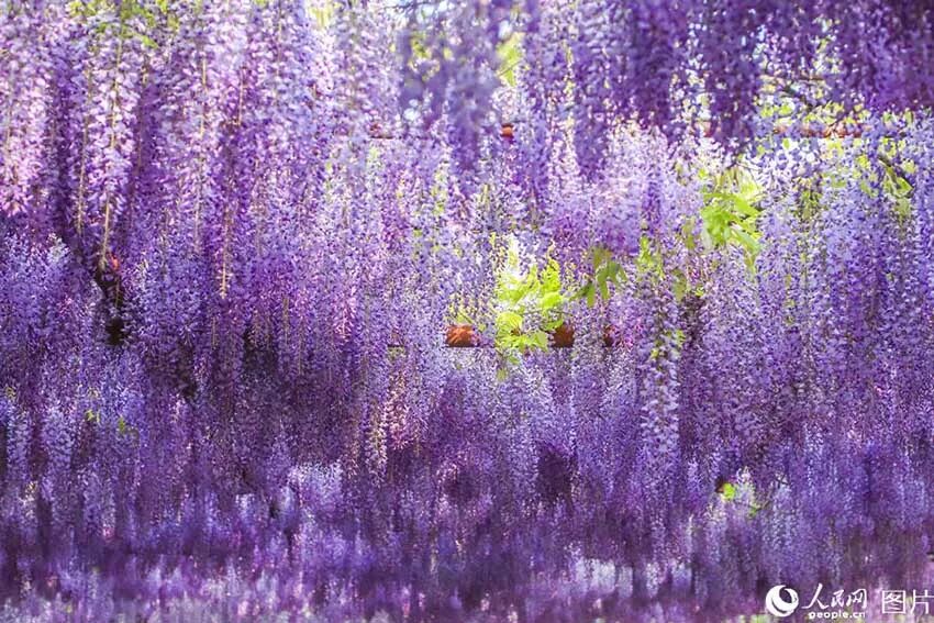 上海市の嘉定紫藤園ではこのほど、100株近くのフジが競うように花を綻ばせ、見ごろを迎えている。花穂が重なり合うように無数に垂れ下がる艶やかな様子はまるで花の滝のようで、穏やかな春風に吹かれたフジの花からはほんのりとした香りが漂い、美しい景色をなしている。