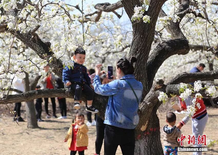 河北省固安県にある約6平方キロメートルの梨園ではこのほど、梨の花が満開シーズンを迎え、北京や天津といった周辺地域の観光客が白く美しい花々を鑑賞しに訪れている。