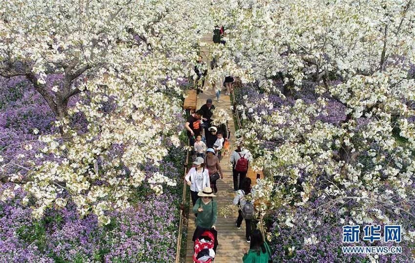 4月3日、江蘇省宿遷市三台山森林公園梨香満園景勝地では、白い梨の花と紫のオオアラセイトウが競い合うように咲き誇り、多くの観光客が同景勝地にその美しい景色を鑑賞しに訪れた。