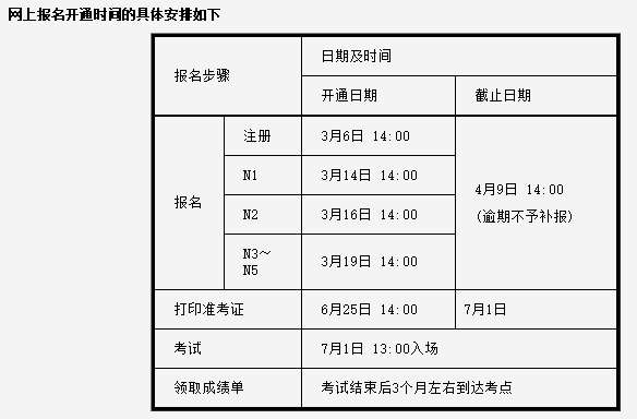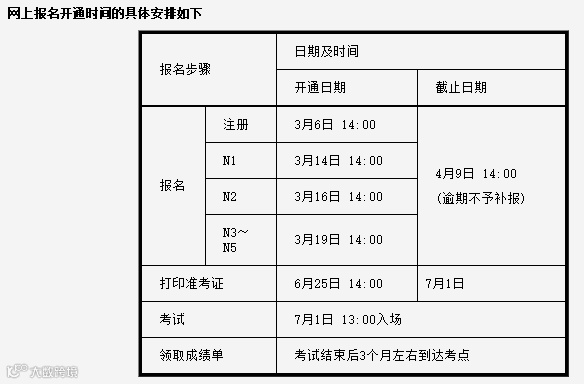 考生在6月25日-7月1日期间可以打印准考证。考试日期为7月1日。每个级别考试(N1-N5)报名时间略有不同,有关报名、考试的相关规定和报名步骤,可通过报名网站的《考生须知》和《报名步骤》了解。