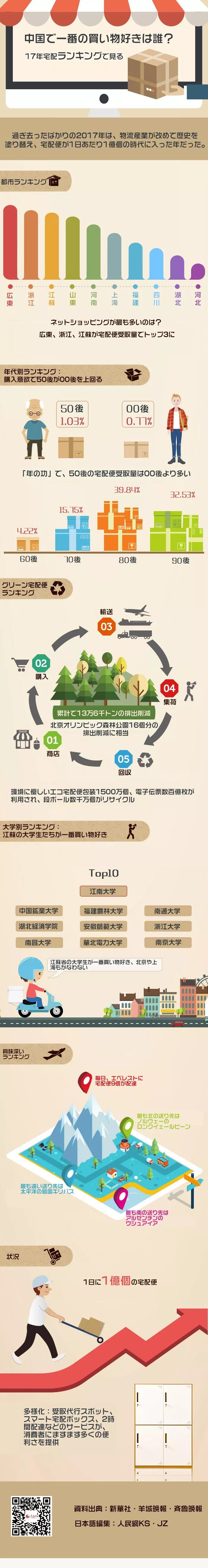 過ぎ去ったばかりの2017年は、物流産業が改めて歴史を塗り替え、宅配便が1日あたり1億個の時代に入った年だった。このほど阿里巴巴(アリババ)傘下の菜烏網絡科技有限公司が発表した2017年の宅配ランキングによると宅配便受取量の上位3省・自治区・直轄市には広東省、浙江省、江蘇省が並び、上海市は6位、北京市はベスト10から外れた。年代別にみると、50後(1950年代生まれ)は還暦を迎えた人が多いが、宅配便の受取量は全体の1.03%を占め、00後(2000年代生まれ)の0.77%を上回った。80後(1980年代生まれ)と90後(1990年代生まれ)は圧倒的な主力パワーで、それぞれ40%と30%近くを占め、70後(1970年代生まれ)が後に続いた。