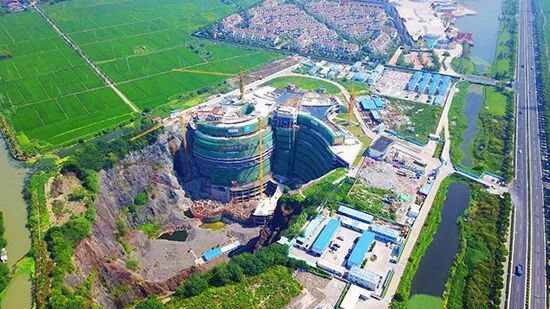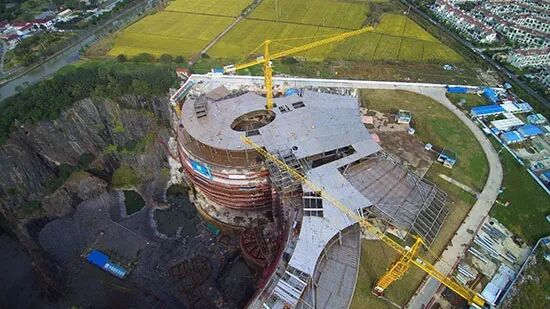 上海市松江区の「深坑ホテル」の主体工事がこのほど、屋根部分まで全て完成し、その全容が初めて明らかになった。施工側の予想では、同ホテルは2018年5月末に試行営業をスタートする見込み。「深坑ホテル」は鉱山跡地の凹みを利用して建設され、完成後は336室の客室を擁し、地上2階・地下16階構造、最も低い2フロアは水面下となる。