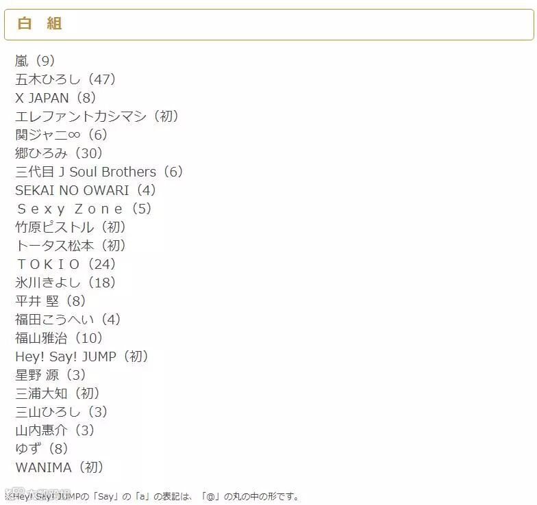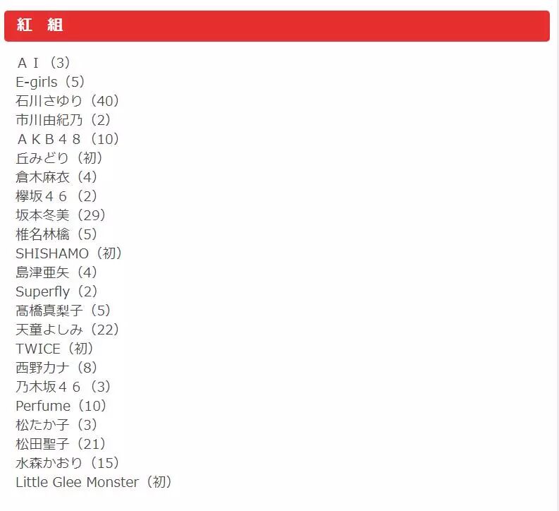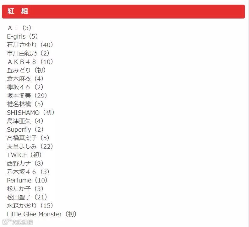 以下是完整名单:(括号内为参加红白次数)