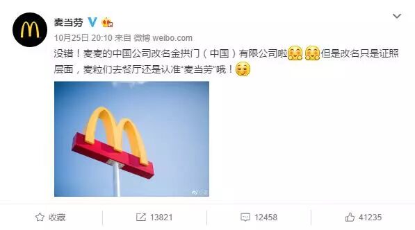 マクドナルドが中国語表記を「麦当労」から「金拱門」に変更するという情報が25日、中国のネットに流れた。事の真偽を確認するため、国家企業信用情報公示システムを調べてみたところ、企業情報の「麦当労(中国)有限公司」が「金拱門(中国)有限公司」に変更されていた。今回の社名変更について、マクドナルド(中国)側は、「当社は中信集団やカーライルの戦略パートナーとなり、業務を発展させていく必要から、今月12日より、マクドナルド中国本社の社名を『金拱門(中国)有限公司』に変更した」と説明した。ただ、社名変更は主に登記情報上の変更だけで、日常業務への影響は全くないとしている。また、「マクドナルドのロゴマーク『M』は確かに拱門(アーチ形の門)に似ている」とした。