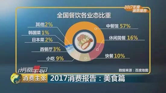 中国調理協会が発表した「2017年度美食消費報告」によると、2017年も引き続き、中国料理が主導的地位を維持し、その市場シェアは最も高く、全体の過半数を占める57%となった。