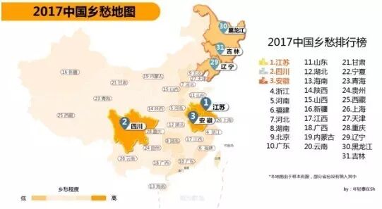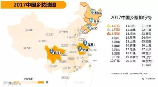 近日,网友“年轻泰”发布2017中国乡愁地图,依次列出中国各省乡愁排名。其中,江苏、四川、安徽占据前三,东三省排名靠后。