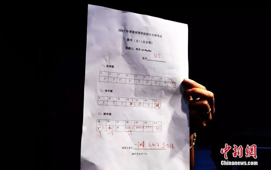6月7日,成都高新造人工智能系统“准星数学高考机器人”AI-MATHS对2017高考数学科目发起了挑战。22分钟内,在没有网络和题库支持下,它完成了一张北京文科数学考卷,得分105分,而满分是150分。