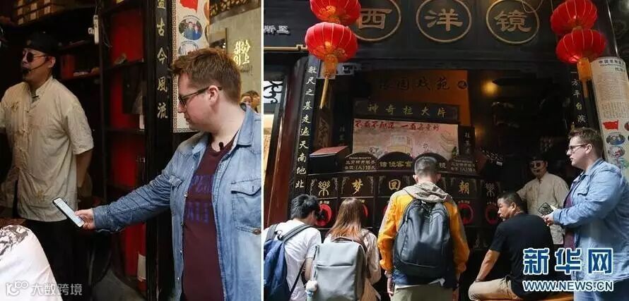 上海城隍廟で、「西洋鏡」のパフォーマンスを鑑賞し、モバイル決済で代金を支払う阿福さん