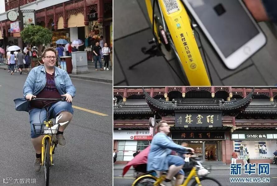 上海城隍廟を見学する際、シェア自転車代金をモバイル決済で支払う阿福さん