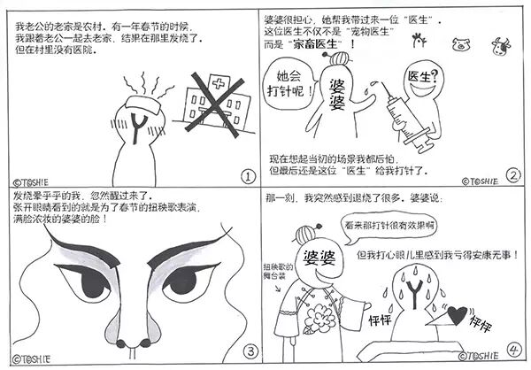 日本妻子Y(在华14年,孩子在读小学):我老公出身农村,有一年我和他一起回乡下过年时突然发烧了。由于当时他的家乡没有诊所,婆婆急忙找来人给我打针。我后来才知道打针的医生是兽医!退烧之后,我一睁眼,化着大浓妆正准备去扭秧歌的婆婆对我说,还是打针管用吧。每每回想起来,我就觉得能活下来真好。