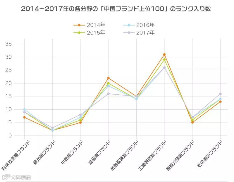 2014年から2017年にかけての中国ブランド上位100ランキングをみると、中国の需給構造がバージョンアップしていることがわかる。供給側をみると、食品産業、工業製造業が供給構造に占める割合が目立って低下し、科学技術産業、観光産業、小売産業、医療介護産業の割合が著しく上昇している。需要側をみると、食品消費の割合が低下する一方で医療介護消費の割合が上昇している。