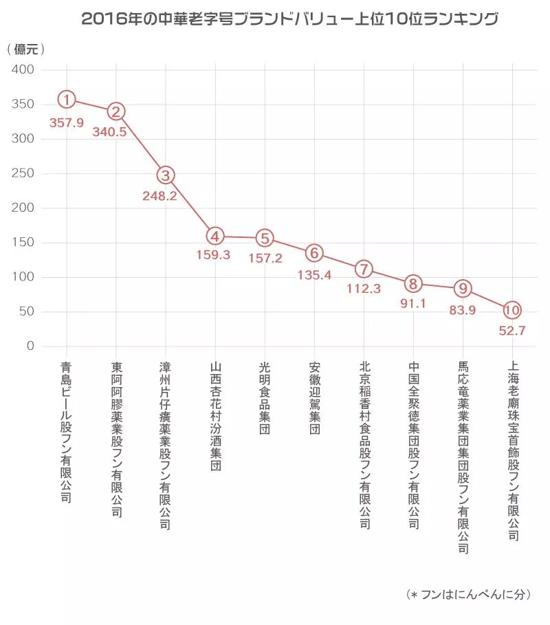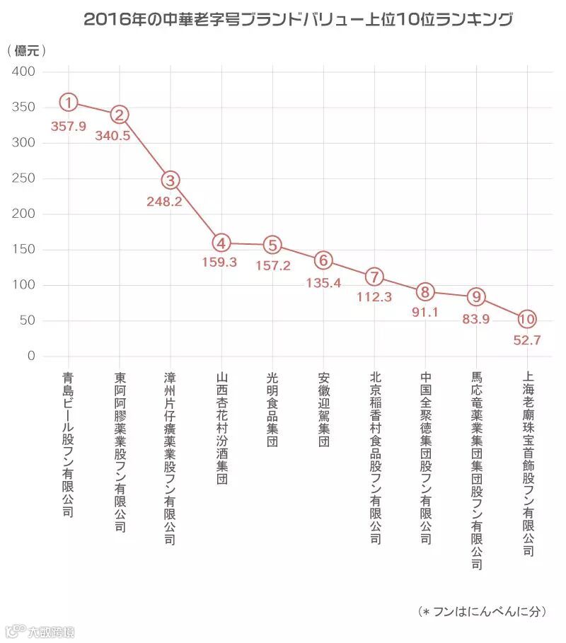 これらの老舗ブランドは政策による保護と時代とともに進む革新により、今もなお強い生命力と競争力を備え、業界のリーダーになっているものもある。2016年の中国老舗ブランドバリューランキングでは、青島ビールが357億9千万元(約5896億2千万円)で1位の栄冠に輝いた。