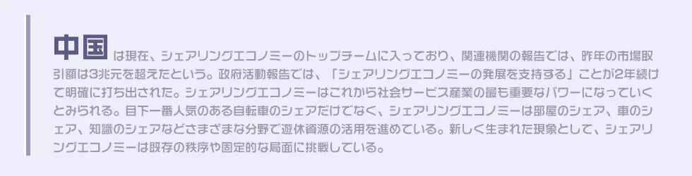 2017年の政府活動報告でも「シェアリングエコノミーの発展を支持、誘導し、社会資源の利用効率を高め、人々の生活を便利にする」と、シェアリングエコノミーを今後1年間の政府活動の重点として挙げられた。