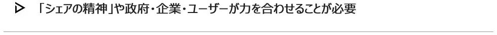 シェアリングエコノミーの発展はシェアリングの精神による支えと切り離せない。現代の社会では、どのような出来事も観念、行為、制度、技術などさまざまな要因がともに作用しあった結果としてそこに存在する。一つの考え方を現実のものにしようとするなら、技術に頼るだけではうまくいかない。「素晴らしいアイディア」を真に輝かせ、持続可能なものにするには、観念や思考といった精神的要素による支えが必要だ。シェアリングエコノミーにシェアリング精神の支えがなければ、歩き出すことは難しく、歩き出したとしても遠くまで行くことはできず、早々に倒れ伏すことになる。