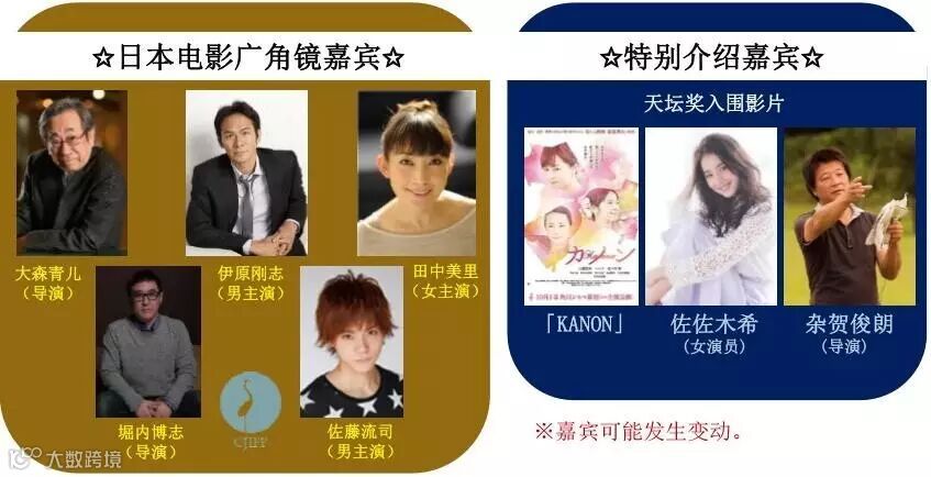 此外,来自日本电影界的知名导演、演员等还将作为嘉宾出席本次日本电影周的相关活动。其中包括开幕影片《家族时光》导演大森青儿、主演伊原刚志、田中美里,影片《残酷的青春》导演堀内博志、主演佐藤流司,以及入围本届“天坛奖”的日本影片《卡农》导演杂贺俊朗、主演佐佐木希。日本冈山县高桥市官方吉祥物备中超人和富山县吉祥物KITOKITO君也将作为日本电影广角镜特邀地方吉祥物嘉宾亮相。