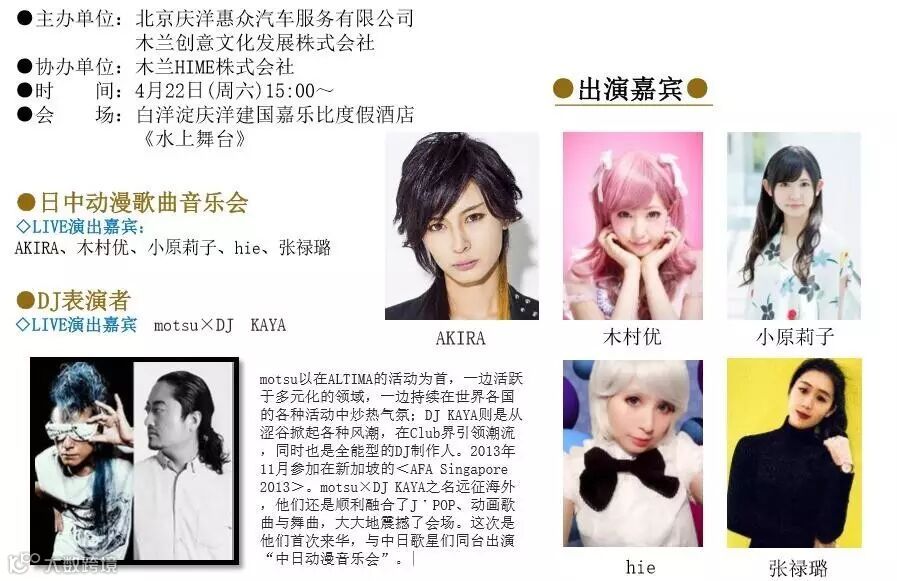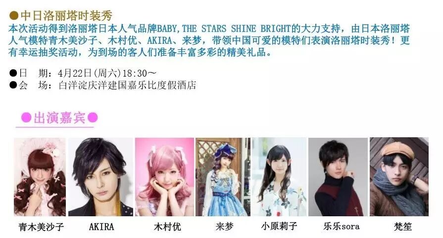 本次“日本电影广角镜”还特别安排了一场充满青春浪漫气息的《中日动漫演唱会&洛丽塔时装秀》。4月22日下午在白洋淀庆洋建国嘉乐比度假酒店,日本洛丽塔人气模特AKIRA、木村优、声优小原莉子、hie将与首次来华的音乐人motsu、DJ KAYA一同带来一场中日动漫歌曲音乐会。同日晚上,日本洛丽塔人气模特青木美沙子、木村优、AKIRA、来梦还将带领中国模特为观众们进行洛丽塔时装秀表演。