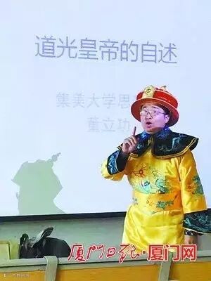 福建省廈門市にある集美大学思想政治教育学部の教師である80後(1980年代生まれ)の董立功先生が7日、普段着で教室に入ると、生徒達はいつものように無気力な状態だった。董先生が「今日、私は中国の清代の第8代皇帝道光帝として、清の衰退史を紹介する」と自分の考えを宣言し、初めて皇帝の礼服と冠を着て登場すると、生徒たちは一斉に目を輝かせ、授業中に携帯電話で遊ぶ生徒が一人もでなかったという。