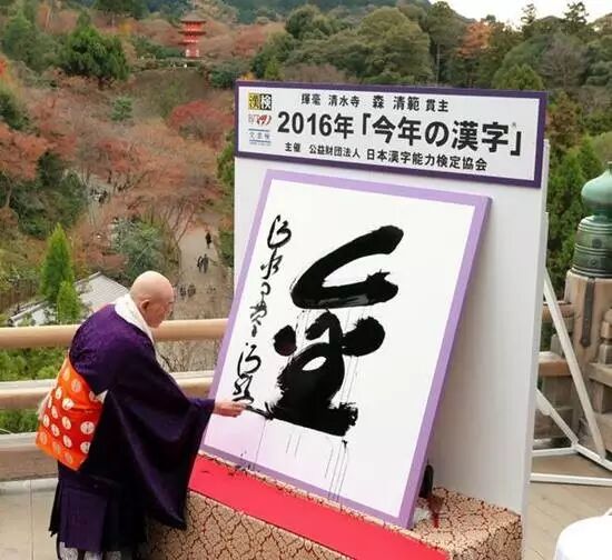 日本2016年度汉字12日公布,当天京都清水寺住持森清范在“清水舞台”宽1.3米、高1.5米的越前和纸上,用广岛产熊野毛笔挥毫写下“金”字。