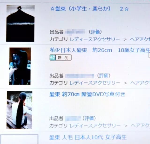 据调查,11月中旬,在日本购物网站雅虎拍卖频道上就出现过出售女性头发的卖家,并标注“中学生的头发,柔软手感良好”。根据网站记录显示,在开始拍卖的35个小时里有14人出价,最后卖出5600日元(约合人民币338元)。此外,网站上还有标记着“高中生头发,清爽干燥”、“十几岁,直发”等商品。