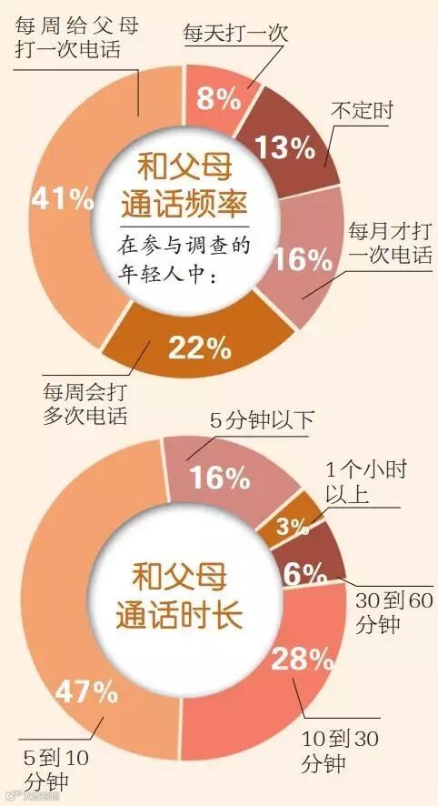 メッセージチャットアプリ「易信」が取りまとめた「休暇中に若者と両親と間で交わされるコミュニケーションに関するオンライン調査」によると、元旦休暇は短すぎるため、ほとんどの若者は実家に戻らず、電話やチャットなどでお互いの近況を報告し合うケースが多いとしている。「週に1度は両親と電話で話す」とした若者の割合は4割を上回り、その通話時間は「だいたい5分から10分」と答えた人が5割近くに上った。