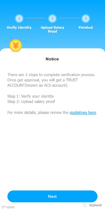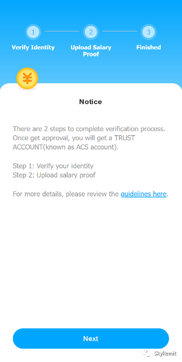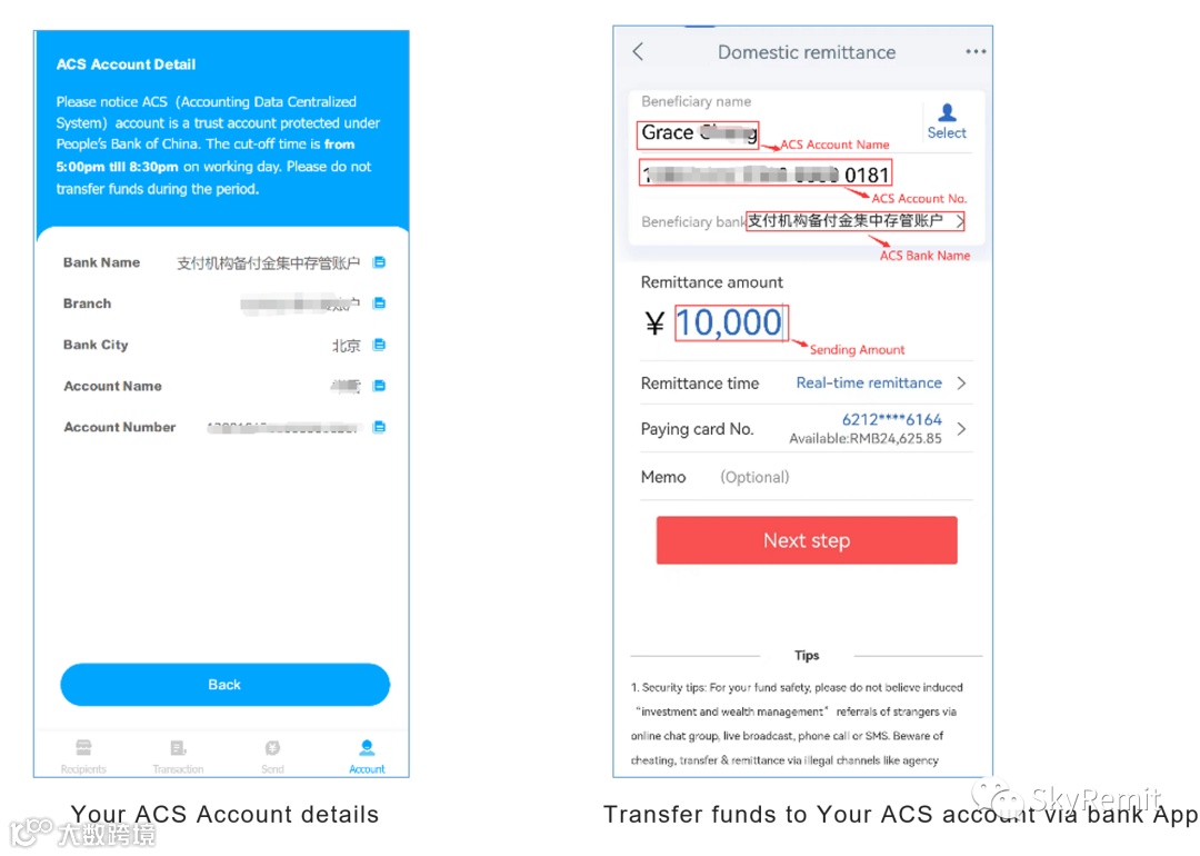 Once you have an ACS account with SkyRemit, you can initiate your first transfer. All funds are transferred between accounts opened in your name during the transaction process, and the transfer is completed through your personal bank's mobile app. Please note that we do not allow transfers from accounts that are not owned by you to your ACS account.
