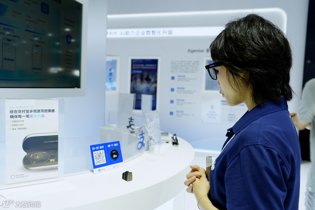 展台现场,Rokid、小米、雷鸟等终端企业联合支付宝展示了可支付的 AI 智能眼镜。用户不用掏手机,通过眼镜即可完成付款。眼镜内置支付宝提供的安全机制,实现了从设备绑定到支付的全链路安全防护和「被盗即赔」保障。