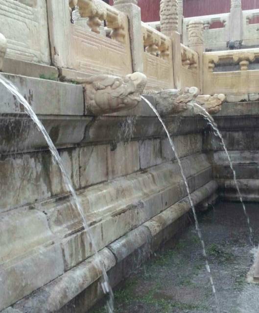 前三殿を例にみてみると、太和殿・中和殿・保和殿は3層の土台の上にあり、その周囲の欄干の底部には雨水を排出する穴がある。欄干の柱の下には精巧な石作りの竜頭があり、その口の中に掘られた穴も排水口となっている。雨水が下層へと流れていき、石台の地面に水がたまることはない。